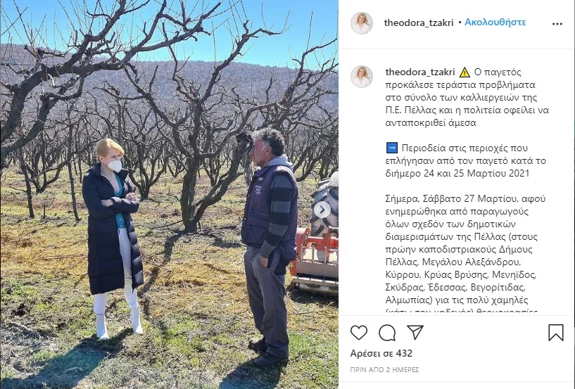 Η ίδια έκανε αναρτήσεις στο Instagram για την περιοδεία της και σημείωσε ότι ενημερώθηκε από παραγωγούς για τον παγετό που προκάλεσε τεράστια προβλήματα στην εκλογική της περιφέρεια.