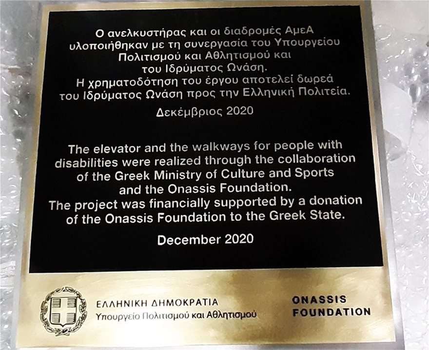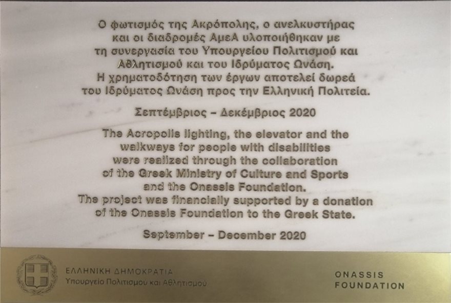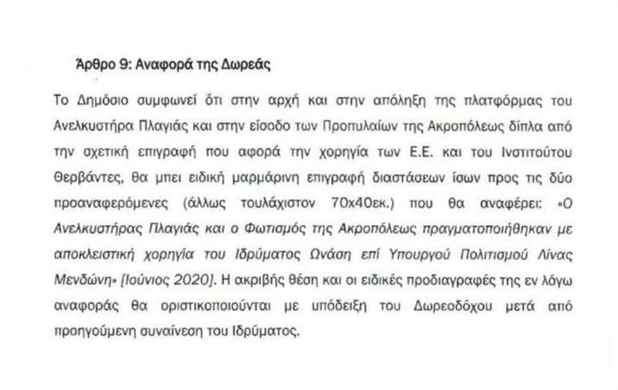 Στην ίδια τη Σύμβαση Δωρεάς που έστειλε η Μενδώνη στη Βουλή αναφέρει στο άρθρο 9 για την Αναφορά Δωρεάς: «Το Δημόσιο συμφωνεί ότι στην αρχή και την απόληξη της πλατφόρμας του Ανελκυστήρα Πλαγιάς και στην είσοδο των Προπυλαίων της Ακρόπολης δίπλα από την σχετική επιγραφή που αφορά την χορηγία της Ε.Ε και του Ινστιτούτου Θερβάντες, θα μπει ειδική μαρμάρινη επιγραφή διαστάσεων ίσων προς τις δύο προαναφερόμενες (άλλως τουλάχιστον 70 x 40 εκ.) που θα αναφέρει: “Ο Ανελκυστήρας Πλαγιάς και ο Φωτισμός της Ακροπόλεως πραγματοποιήθηκαν με αποκλειστική χορηγία του Ιδρύματος Ωνάση επί Υπουργού Πολιτισμού Λίνας Μενδώνη (Ιούνιος 2020)”».