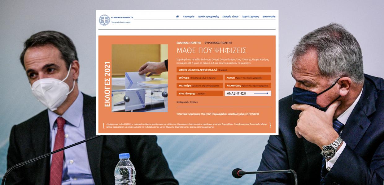 Αν σήμερα γκουγκλάρει κάποιος «μάθε πού ψηφίζεις», η πλατφόρμα της google θα αποδώσει πρώτο-πρώτο τον σύνδεσμο με την σχετική σελίδα του υπουργείου Εσωτερικών. Μόνο που, όποιος πατήσει τον σύνδεσμο, θα δει με έκπληξη ότι στο αριστερό μέρος της οθόνης, αναγράφεται «ΕΚΛΟΓΕΣ 2021».