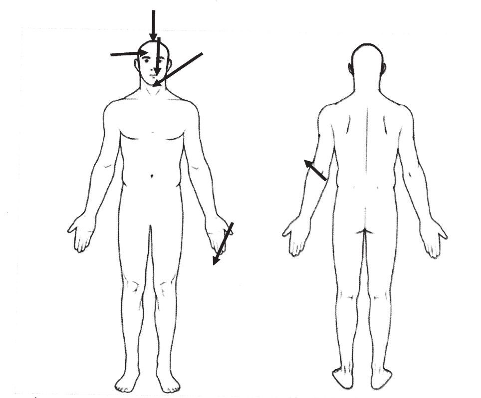 Πρόκειται για κακώσεις στη δεξιά πλευρά του προσώπου, κυρίως στο μέτωπο, που δεν προέρχονται από την προπέλα του σκάφους του, αλλά από κάποιο αντικείμενο μικρότερου μεγέθους.