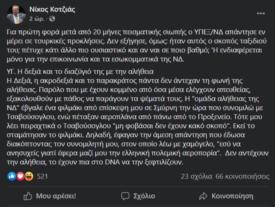 Ο κ. Κοτζιάς αναφέρει ότι απάντησε τότε με χαμόγελο στον Τσαβούσογλου ότι «εσύ να ανησυχείς γιατί έφερα μαζί μου την ελληνική πολεμική αεροπορία»: «Δεν αντέχουν την αλήθεια, το έχουν πια στο DNA να την ξεφτιλίζουν» καταλήγει.