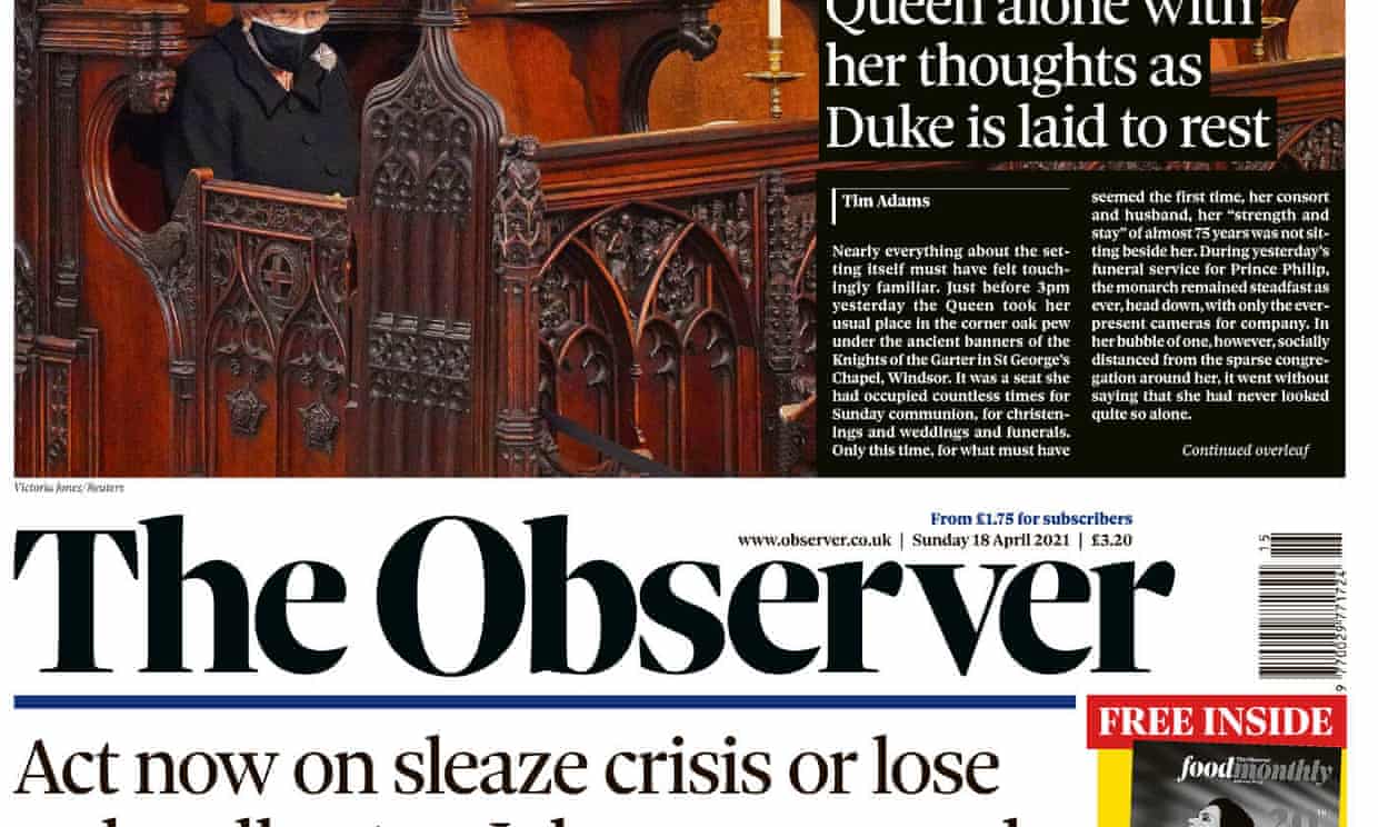 «Η βασίλισσα καθιστή και μόνη λέει το τελευταίο αντίο», είναι ο τίτλος στο πρωτοσέλιδο και επισημαίνεται ότι «αν και τα τέσσερα παιδιά της ήταν στην εκκλησία, δεν είχε κανένα χέρι να κρατήσει και κανέναν να την παρηγορήσει με ένα ελαφρύ χτύπημα στο μπράτσο», καθώς ήταν υποχρεωτικό να τηρηθούν οι αποστάσεις.