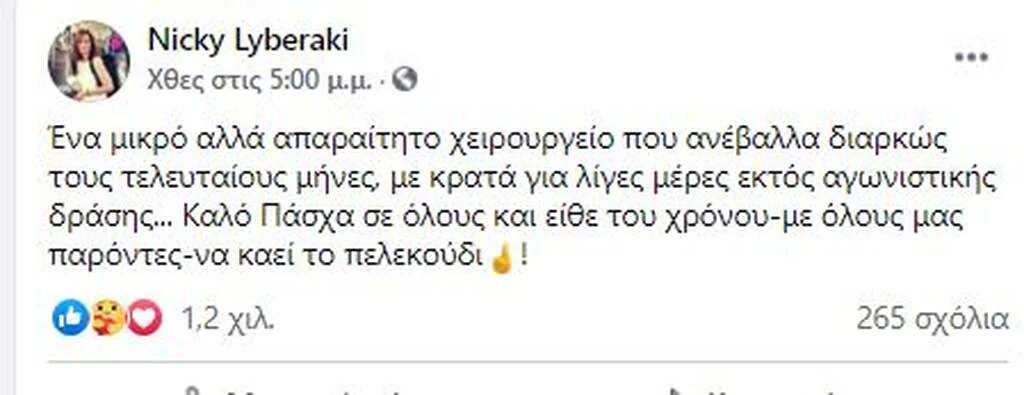Αποκάλυψε ότι έπρεπε να προχωρήσει σε ένα απαραίτητο χειρουργείο που συνεχώς έπαιρνε αναβολή. «Ένα μικρό αλλά απαραίτητο χειρουργείο που ανέβαλλα διαρκώς τους τελευταίους μήνες, με κρατά για λίγες μέρες εκτός αγωνιστικής δράσης. Καλό Πάσχα σε όλους και είθε του χρόνου – με όλους μας παρόντες – να καεί το πελεκούδι», ήταν το μήνυμα της Λυμπεράκη στον προσωπικό της λογαριασμό στο Facebook.