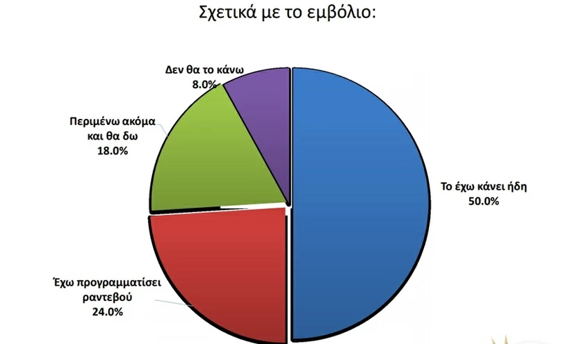 Το 50% των ερωτηθέντων δηλώνει ότι έχει ήδη εμβολιαστεί κι ένα 24% έχει προγραμματισμένο ραντεβού ενώ μόνο το 26% φαίνεται ότι δε θα εμβολιαστεί ή εμφανίζεται επιφυλακτικό.
