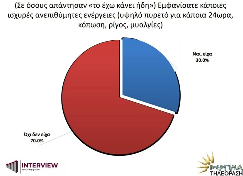 Αναλυτικότερα, αναφορικά με τις ανεπιθύμητες ενέργειες όσων εμβολιάστηκαν, η δημοσκόπηση δείχνει ότι το 70% δεν εμφάνισε καθόλου παρενέργειες.