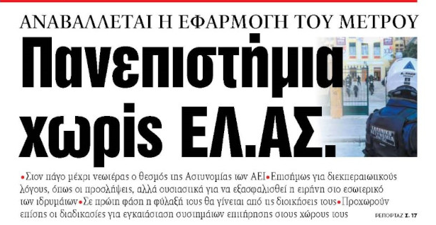 Το πρωτοσέλιδο ρεπορτάζ της φιλοκυβερνητικής εφημερίδας «Τα Νέα», επιβεβαιώνει αυτό που είχε προαναγγελθεί εδώ και καιρό, πως η κυβέρνηση προσανατολίζεται στο να αναβάλει την δημιουργία της πανεπιστημιακής αστυνομίας, επισήμως για λόγους διεκπεραιωτικούς, αλλά, ουσιαστικά επειδή φοβάται νέες εντάσεις.