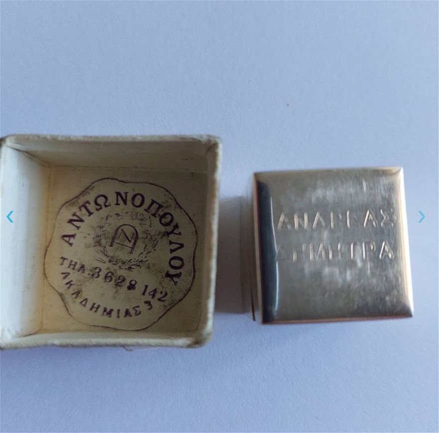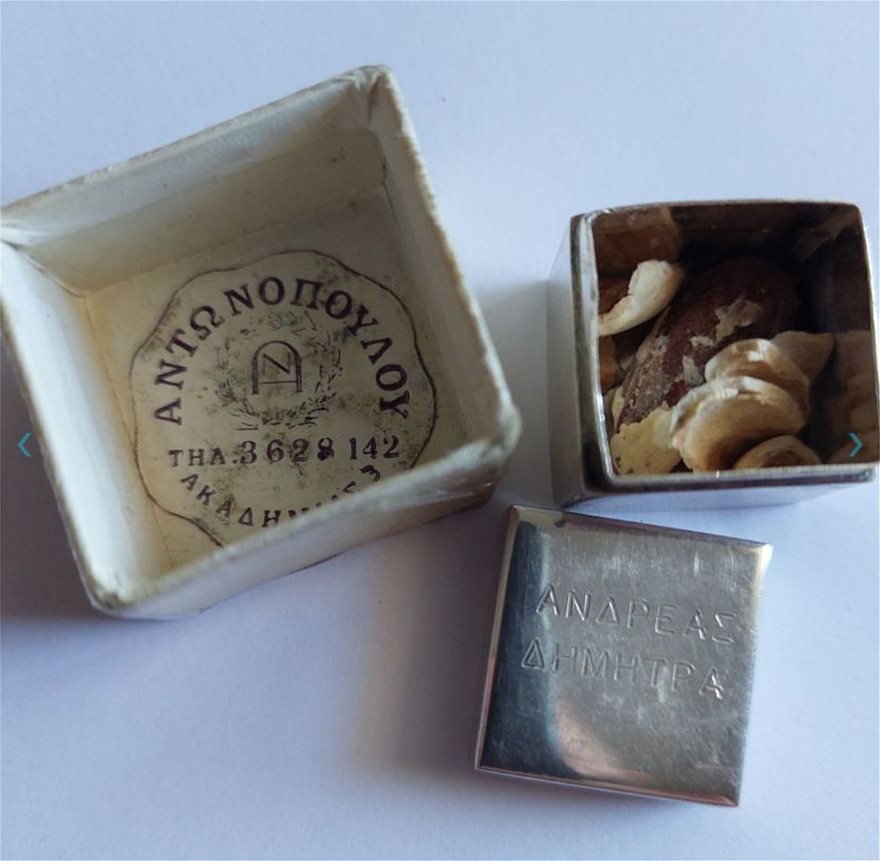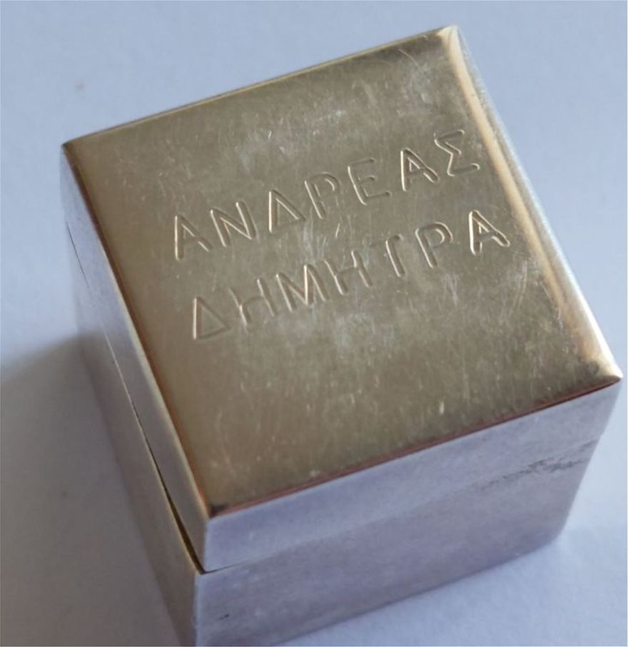 Η ασημένια μπομπονιέρα που μοιάζει με κουτί φέρει στο επάνω της μέρος σκαλιστά τα ονόματα των νιόπαντρων “Ανδρέας – Δήμητρα”, ενώ στο εσωτερικό του υπάρχει η σφραγίδα του διάσημου οίκου στο Κολωνάκι.