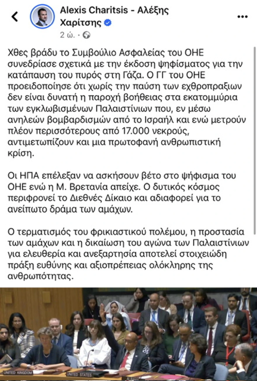 Στη χθεσινή συνεδρίαση του Συμβουλίου Ασφαλείας του ΟΗΕ για την κατάπαυση του πυρός στη Γάζα αναφέρθηκε ο επικεφαλής της Νέας Αριστεράς, Αλέξης Χαρίτσης, σχολιάζοντας πως «ο τερματισμός του φρικιαστικού πολέμου, η προστασία των αμάχων και η δικαίωση του αγώνα των Παλαιστίνιων για ελευθερία και ανεξαρτησία αποτελεί στοιχειώδη πράξη ευθύνης και αξιοπρέπειας ολόκληρης της ανθρωπότητας».