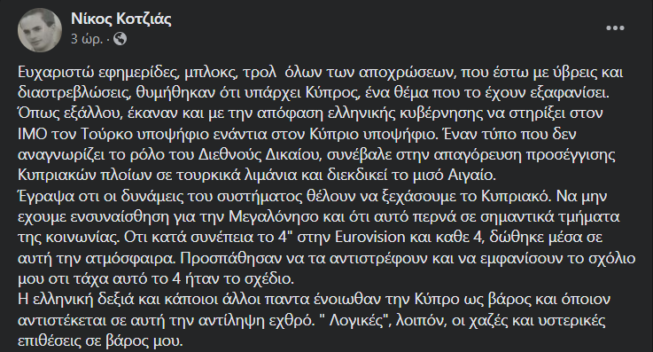 Αναλυτικά η νέα ανάρτηση του Νίκου Κοτζιά: