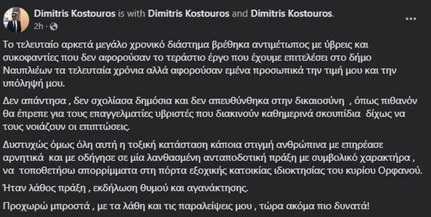 Στην απολογητική του ανάρτηση ο Δημήτρης Κωστούρος, λέει: «Το τελευταίο αρκετά μεγάλο χρονικό διάστημα βρέθηκα αντιμέτωπος με ύβρεις και συκοφαντίες που δεν αφορούσαν το τεράστιο έργο που έχουμε επιτελέσει στο δήμο Ναυπλιέων τα τελευταία χρόνια αλλά αφορούσαν εμένα προσωπικά την τιμή μου και την υπόληψή μου. Δεν απάντησα , δεν σχολίασα δημόσια και δεν απευθύνθηκα στην δικαιοσύνη , όπως πιθανόν θα έπρεπε για τους επαγγελματίες υβριστές που διακινούν καθημερινά σκουπίδια δίχως να τους νοιάζουν οι επιπτώσεις. Δυστυχώς όμως όλη αυτή η τοξική κατάσταση κάποια στιγμή ανθρώπινα με επηρέασε αρνητικά και με οδήγησε σε μία λανθασμένη ανταποδοτική πράξη με συμβολικό χαρακτήρα , να τοποθετήσω απορρίμματα στη πόρτα εξοχικής κατοικίας ιδιοκτησίας του κυρίου Ορφανού. Ήταν λάθος πράξη , εκδήλωση θυμού και αγανάκτησης. Προχωρώ μπροστά , με τα λάθη και τις παραλείψεις μου , τώρα ακόμα πιο δυνατά!».