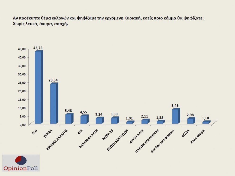 (Ανανέωση από αρχικό κείμενο 10.30) Στις 19 μονάδες έχει εκτοξευτεί η διαφορά στην πρόθεση ψήφου μεταξύ ΝΔ και ΣΥΡΙΖΑ σύμφωνα με δημοσκόπηση της εταιρίας Opinion Poll.