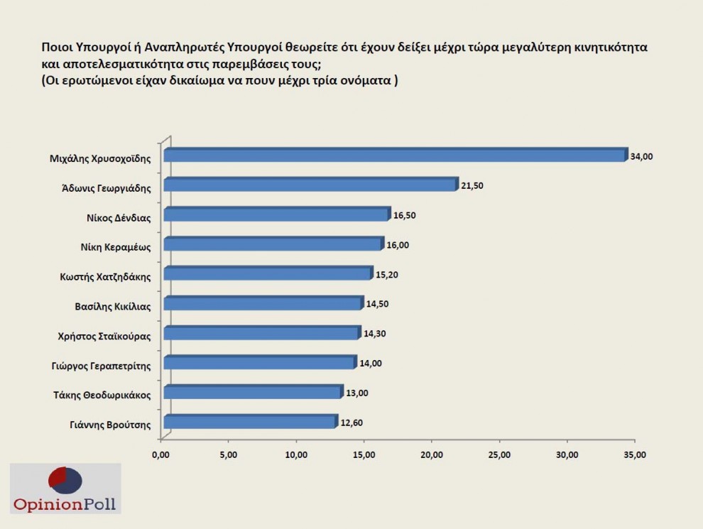 Πρώτος με διαφορά είναι ο υπουργός Προστασίας του Πολίτη Μιχάλης Χρυσοχοίδης και καθαρά δεύτερος, μακριά από τον τρίτο ο υπουργός Ανάπτυξης Άδωνις Γεωργιάδης. Την πρώτη πεντάδα συμπληρώνουν οι Νίκος Δένδιας, Νίκη Κεραμέως και Κωστής Χατζηδάκης.