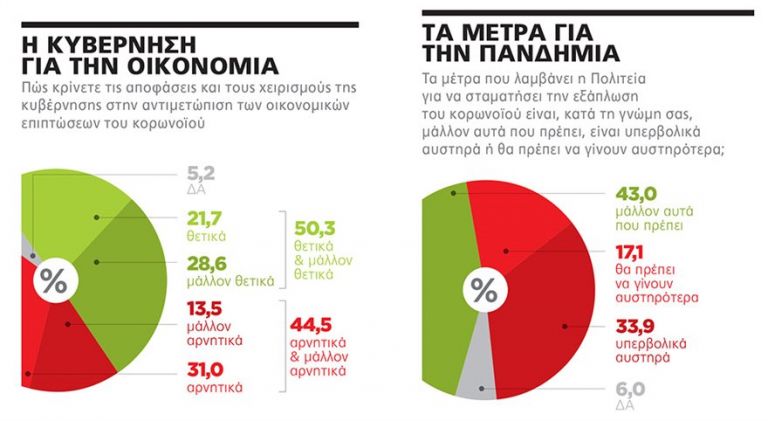 Στην αξιολόγηση των μέτρων που λαμβάνει η κυβέρνηση για την αντιμετώπιση της πανδημίας ένα ποσοστό 43% συμφωνεί, ενώ το 33,9% ζητά ακόμη πιο αυστηρή αντιμετώπιση. Στον αντίποδα, το 17,1% των ερωτηθέντων πιστεύει ότι τα μέτρα είναι υπερβολικά αυστηρά.