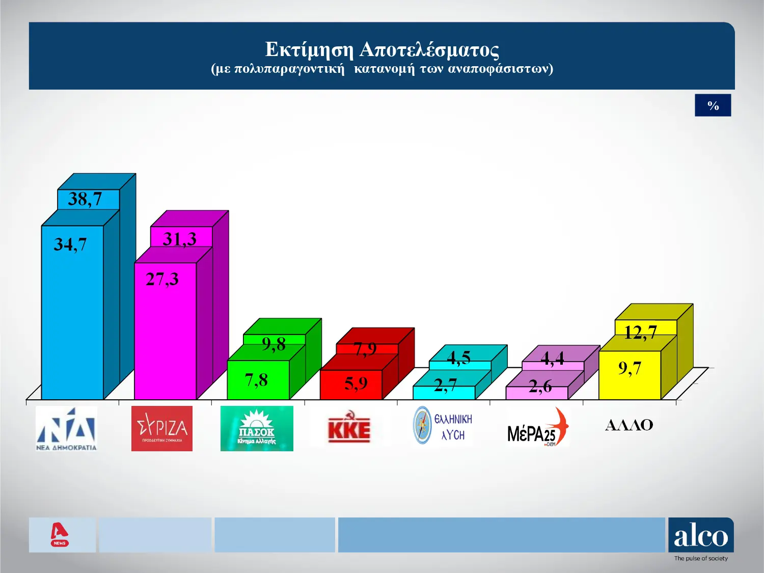 Συγκεκριμένα σύμφωνα με τη δημοσκόπηση της Alco στην πρόθεση επί των εγκύρων η Νέα Δημοκρατία προηγείται με 6,7 μονάδες καθώς συγκεντρώνει ποσοστό 32,7% έναντι 26% του ΣΥΡΙΖΑ. Ακολουθεί το ΠΑΣΟΚ με 8,3%, το ΚΚΕ με 6,1%, η Ελληνική Λύση με 3,7%, το ΜέΡΑ25 με 3,3% ενώ οι αναποφάσιστοι φτάνουν το 11%.