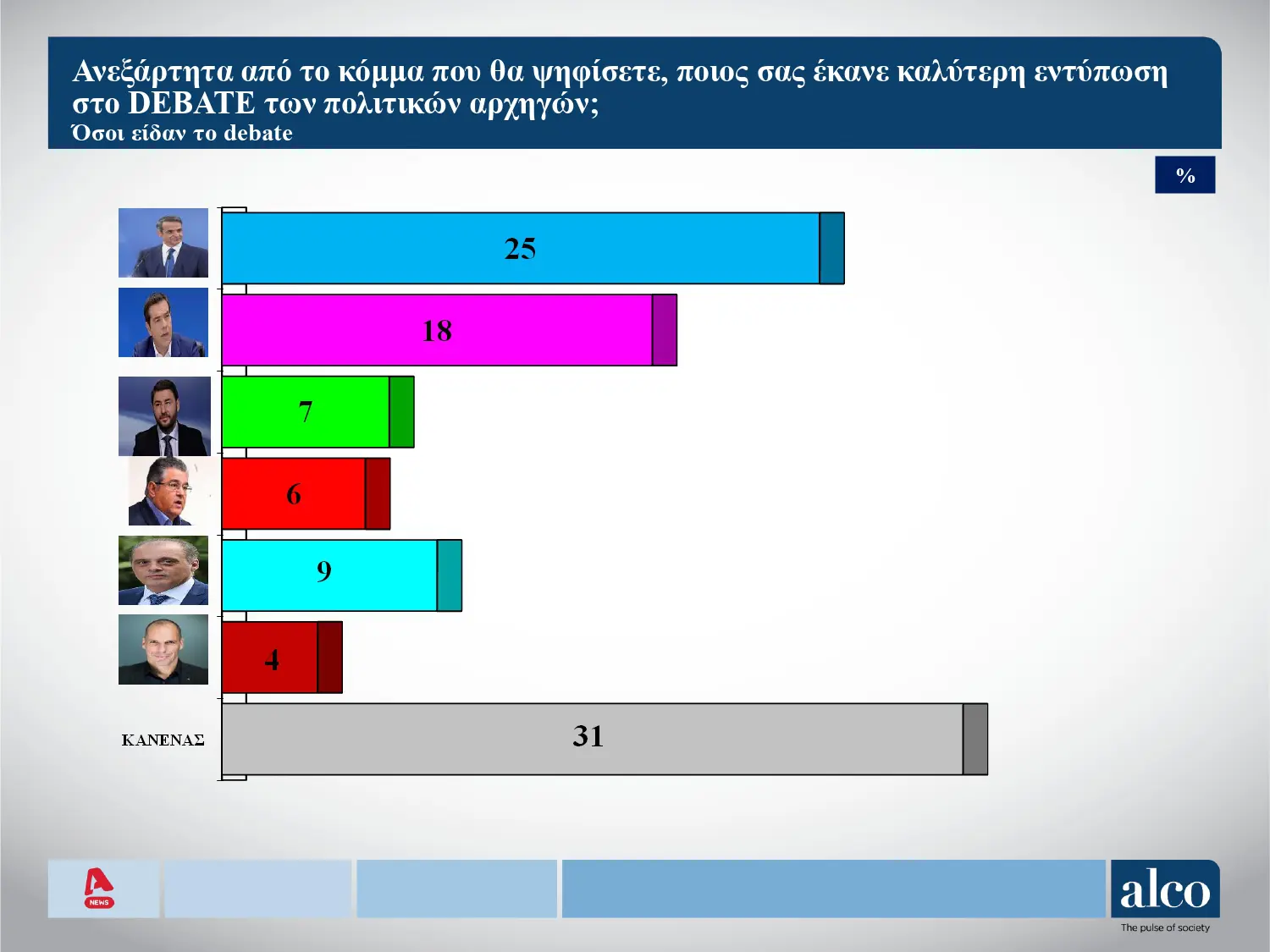 Ανεξάρτητα από το τι θα ψηφίσετε, ποιος πολιτικός αρχηγός σας έκανε καλύτερη εντύπωση στο ντιμπέιτ οι πολίτες απάντησαν ο Κυριάκος Μητσοτάκης σε ποσοστό 25% και ακολουθούν ο Αλέξης Τσίπρας με 18%, ο Κυριάκος Βελόπουλος με 9%, ο Νίκος Ανδρουλάκης με 7%, ο Δημήτρης Κουτσούμπας με 6% και ο Γιάνης Βαρουφάκης με 4%, ενώ ο κανένας έχει ποσοστό 31%.