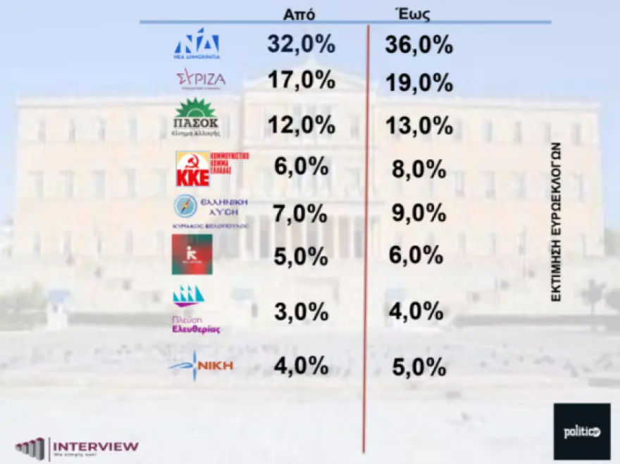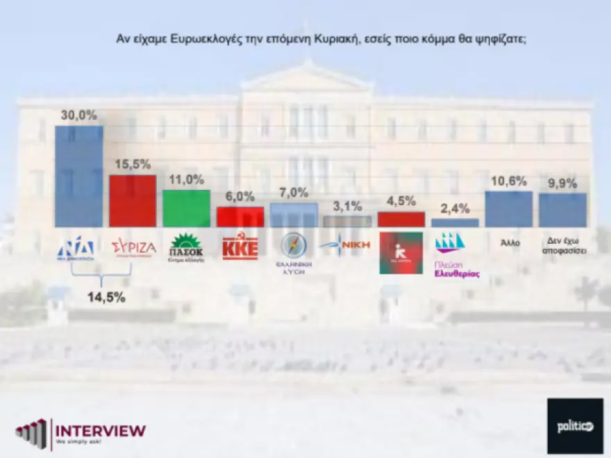 Η δημοσκόπηση της εταιρείας Interview που πραγματοποιήθηκε ενόψει των Ευρωεκλογών της 9ης Ιουνίου, δείχνει σχεδόν διπλάσια είναι η διαφορά της Νέας Δημοκρατίας από τον ΣΥΡΙΖΑ στην πρόθεση ψήφου.