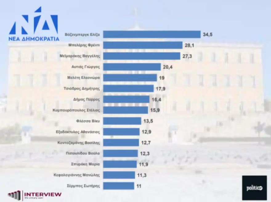 Στην ίδια δημοσκόπηση έχουν μετρηθεί και οι υποψήφιοι Ευρωβουλευτές με την κατάταξη στο ευρωψηφοδέλτιο της ΝΔ να είναι Ελίζα Βόζεμπεργκ με ποσοστό 34,5%, Φρέντι Μπελέρης (28,1%), Βαγγέλης Μεϊμαράκης (27,3%), Γιώργος Αυτιάς (20,4%), Ελεονώρα Μελέτη (19%), Δημήτρης Τσιόδρας (17,9%), Πύρρος Δήμας (16,4%) και Στέλιος Κυμπουρόπουλος (15,9%).