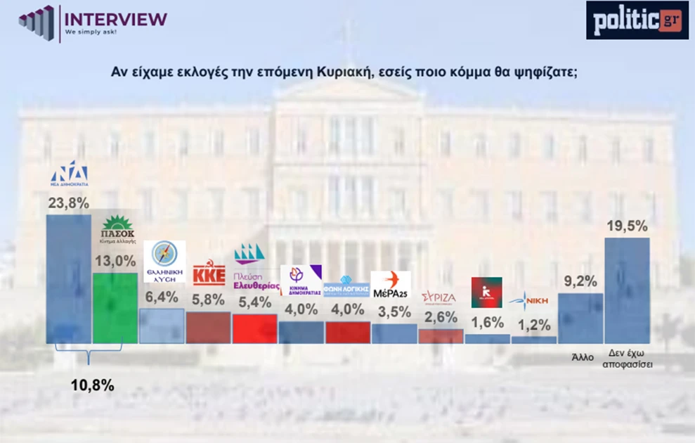 Η νέα δημοσκόπηση της Interview δείχνει τη Νέα Δημοκρατία να διατηρεί την πρώτη θέση με 23,8%, ενώ οι αναποφάσιστοι «αγγίζουν» σχεδόν το 20% του εκλογικού σώματος.