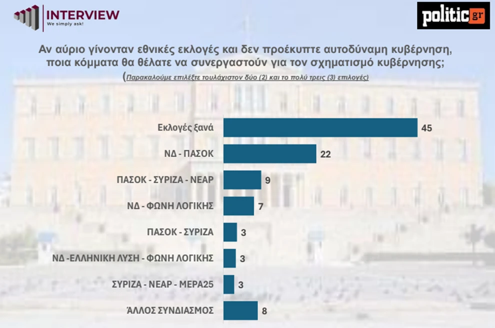 Σε περίπτωση που δεν εξασφαλιστεί αυτοδυναμία, η πλειονότητα των πολιτών φαίνεται να προτιμά την επανάληψη των εκλογών έναντι συνεργασιών κομμάτων. Το 45% των ερωτηθέντων δηλώνει ότι θα προτιμούσε νέες εκλογές, ενώ μόνο το 22% επιλέγει τη συνεργασία ΝΔ – ΠΑΣΟΚ, σενάριο που συγκεντρώνει τη μεγαλύτερη αποδοχή. Ακολουθούν με χαμηλότερα ποσοστά οι συνδυασμοί ΠΑΣΟΚ – ΣΥΡΙΖΑ – Νέα Αριστερά (9%) και ΝΔ – Φωνή Λογικής (7%), ενώ τα σενάρια ΠΑΣΟΚ – ΣΥΡΙΖΑ, ΝΔ – Ελληνική Λύση – Φωνή Λογικής και ΣΥΡΙΖΑ – Νέα Αριστερά – ΜέΡΑ25 συγκεντρώνουν από 3% το καθένα.