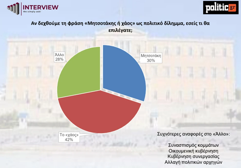 Στο καθιερωμένο πολιτικό δίλημμα «Μητσοτάκης ή χάος», το 42% των ερωτηθέντων απαντά «το χάος», ενώ το 30% επιλέγει τον Κυριάκο Μητσοτάκη και ένα 28% δηλώνει «Άλλο», με συχνές αναφορές σε συνασπισμούς κομμάτων, οικουμενική κυβέρνηση ή αλλαγή πολιτικών αρχηγών. Η υψηλή επιλογή της κατηγορίας «Άλλο» δείχνει ότι η επίκληση του φόβου ή της ανασφάλειας δεν πείθει πλέον την πλειονότητα, καθώς ένα σημαντικό τμήμα των πολιτών αναζητά πιο μετριοπαθείς και διαφορετικές μορφές πολιτικής εκπροσώπησης.