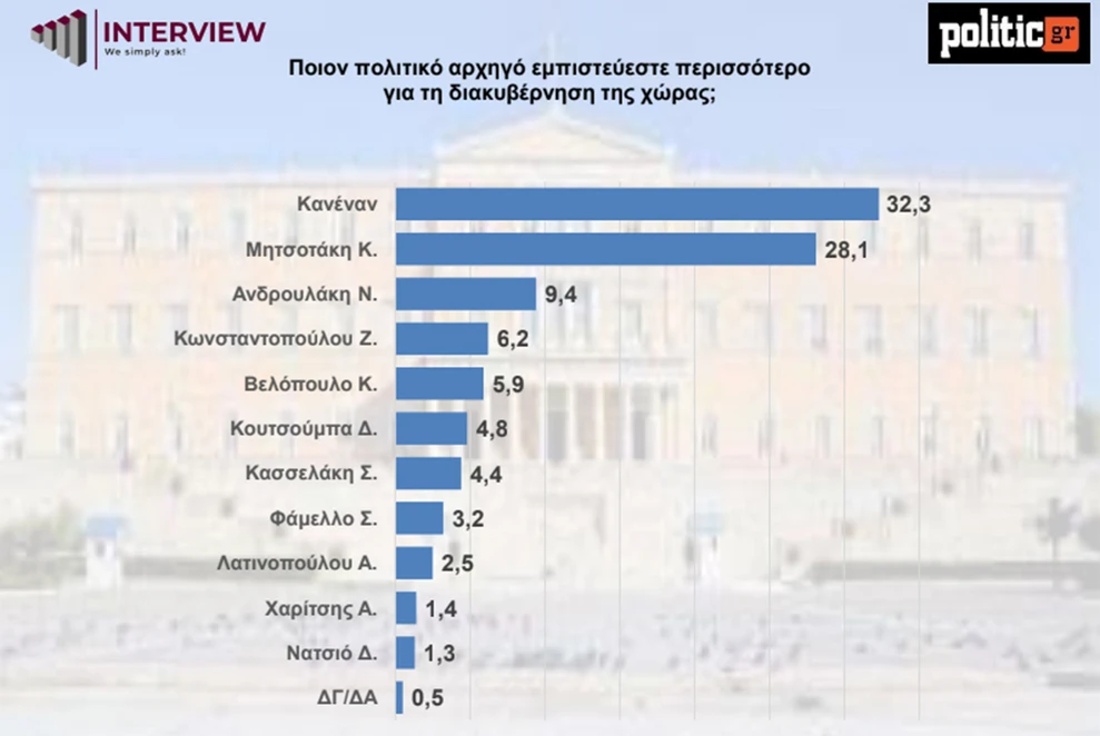 Στην ερώτηση για τον πολιτικό αρχηγό που εμπιστεύονται περισσότερο για τη διακυβέρνηση, προηγείται η απάντηση «Κανένας» με 32,3%, ακολουθούμενη από τον Κυριάκο Μητσοτάκη με 28,1%, τον Νίκο Ανδρουλάκη με 9,4%, τη Ζωή Κωνσταντοπούλου με 6,2%, τον Κυριάκο Βελόπουλο με 5,9% και τον Δημήτρη Κουτσούμπα με 4,8%. Ο Στέφανος Κασσελάκης συγκεντρώνει 4,4%, ενώ η κατάταξη συνεχίζεται με τον Σωκράτη Φάμελλο (3,2%), την Αφροδίτη Λατινοπούλου (2,5%), τον Αλέξη Χαρίτση (1,4%) και τον Δημήτρη Νατσιό (1,3%).