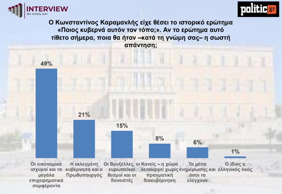 Τέλος, στο ερώτημα «Ποιος κυβερνά αυτόν τον τόπο;», σχεδόν ένας στους δύο πολίτες (49%) θεωρεί ότι κυριαρχούν τα οικονομικά συμφέροντα και οι μεγάλες επιχειρήσεις, το 21% απαντά η εκλεγμένη κυβέρνηση και ο πρωθυπουργός, το 15% αναφέρει τις Βρυξέλλες, τους ευρωπαϊκούς θεσμούς και τους δανειστές, ενώ μόλις 8% πιστεύει ότι η χώρα λειτουργεί χωρίς πραγματική διακυβέρνηση, το 6% καταλογίζει ευθύνη στα μέσα ενημέρωσης και μόνο το 1% εκτιμά ότι κυβερνά ο ελληνικός λαός.