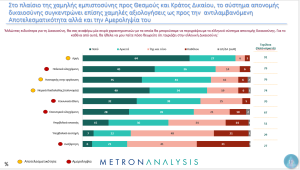 Ενδεικτικά, μιλώντας με ποσοστά, μόλις 22% των πολιτών εκφράζει εμπιστοσύνη στη Δικαιοσύνη και μόλις 6% στα πολιτικά κόμματα.