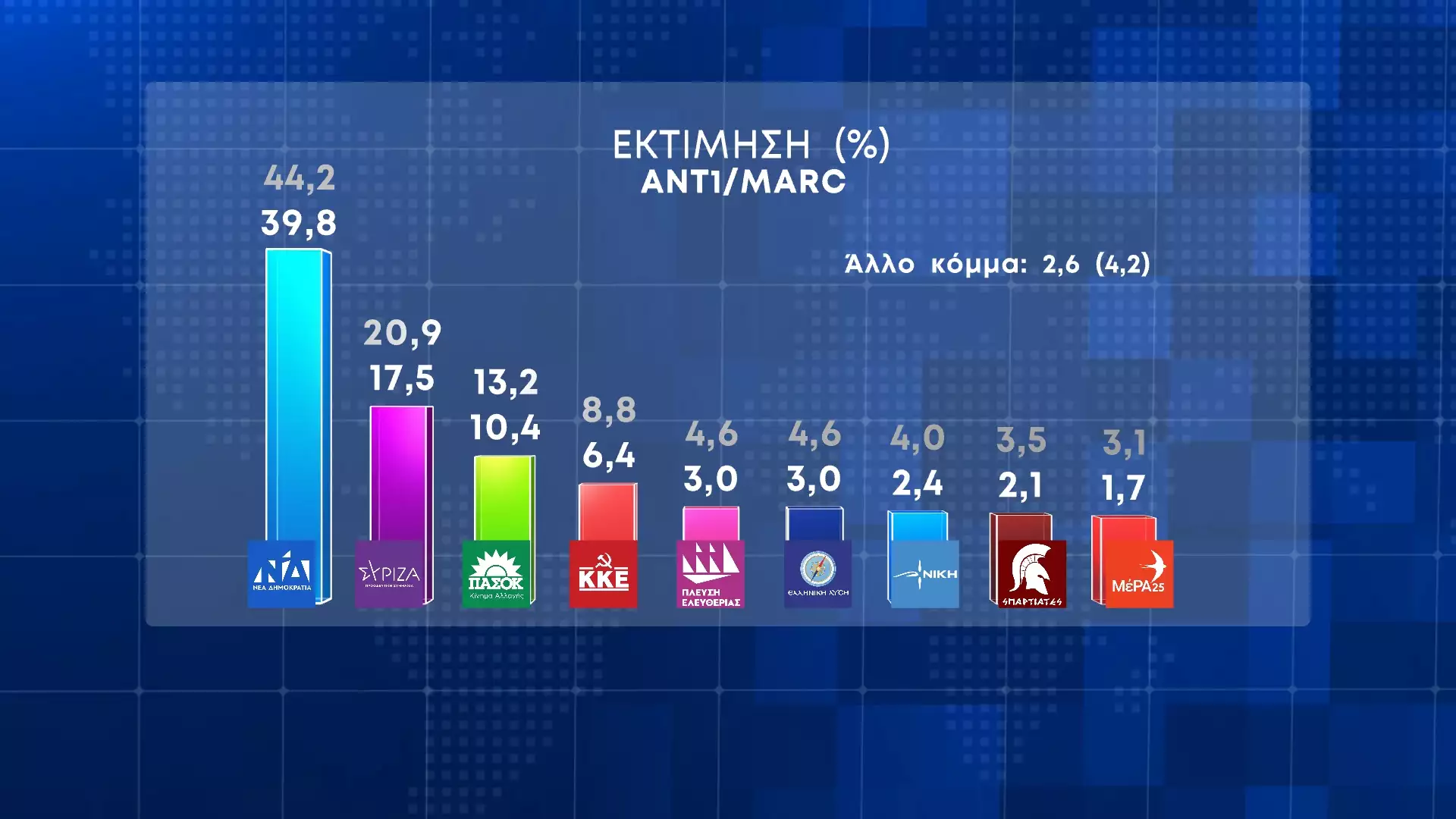 Στην εκτίμηση ψήφου, τα κόμματα συγκεντρώνουν τα εξής ποσοστά: