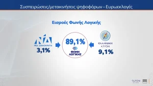 Στη Φωνή Λογικής, η δημοσκόπηση δείχνει πως οι 9 στους 10 κατέληξαν στο κόμμα της Λατινοπούλου, στην Ελληνική Λύση το 9,1% και στη ΝΔ το 3,1%. Η συσπείρωση των ψηφοφόρων της είναι στο 89,1%.