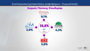 Η Πλεύση Ελευθερίας, που παρουσιάζει σημαντική άνοδο στην πρόθεση ψήφου, έχει σημαντικές εισροές από τέσσερα κόμματα.