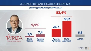 Ακόμη χειρότερα, στο ίδιο ερώτημα, είναι τα ποσοστά για τον ΣΥΡΙΖΑ, που μετρά 83,4% αρνητικές γνώμες, ενώ οριακά είναι σε… μονοψήφιο οι θετικές (9,9%).