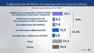 Στο ερώτημα για το κυβερνητικό σχήμα που θα προτιμούσαν μέσα από τις επόμενες εκλογές, το 39% είναι υπέρ μιας κυβέρνησης συνεργασίας, με το μεγαλύτερο ποσοστό να είναι υπέρ του σχηματισμού ΠΑΣΟΚ-ΣΥΡΙΖΑ με 25,1%.