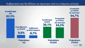 Στο ίδιο ερώτημα στους ψηφοφόρους των κομμάτων, οι ψηφοφόροι της ΝΔ θέλουν αυτοδύναμο το κόμμα τους σε ποσοστό 62,5%, ενώ το 9,9% λέει συγκυβέρνηση με ΠΑΣΟΚ και το 8,7% με άλλα δεξιά κόμματα.