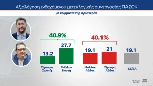 Στο ενδεχόμενο συνεργασίας ΠΑΣΟΚ με κόμματα της Αριστεράς, οι πολίτες είναι διχασμένοι, καθώς το 40,9% θεωρεί σωστή αυτή την κίνηση, το 40,1% τη θεωρεί λανθασμένη και το 19,1% δεν έχει ξεκάθαρη απάντηση.