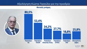 Στην αξιολόγηση των υποψηφίων για την Προεδρία της Δημοκρατίας , ο Κώστας Τασούλας έχει θετικές γνώμες σε ποσοστό 80,5%, ενώ πάνω από τους μισούς ψηφοφόρους του ΠΑΣΟΚ (52,4%) συμφωνούν επίσης.
