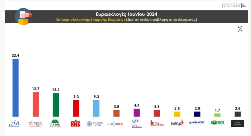 Στη βάση των παραπάνω ορίων, η κεντρική τιμή της εκτίμησης για τη Νέα Δημοκρατία είναι 32.4%, για τον ΣΥΡΙΖΑ-ΠΣ 13.7%, για το ΠΑΣΟΚ-ΚΙΝΑΛ 13.2%, το ΚΚΕ και την Ελληνική Λύση 9.3%, τη Νίκη 3.8%, τη Νέα Αριστερά 3.8%, το ΜεΡΑ25 και τη Φωνή Λογικής 2.8%, ενώ για το Κόσμος 1.7%.