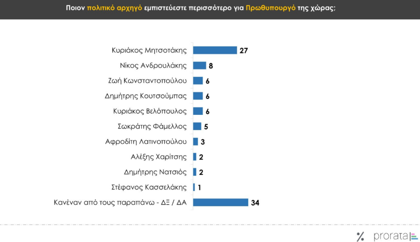 Στην ίδια δημοσκόπηση καταγράφεται και η επιλογή του Κυριάκου Μητσοτάκη ως καταλληλότερος πρωθυπουργός. Στη σχετική ερώτηση, χωρίς τον Αλέξη Τσίπρα και τον Αντώνη Σαμαρά, ο σημερινός πρωθυπουργός προηγείται με 27% και ακολουθούν ο Ν. Ανδρουλάκης με 8% και η Ζ. Κωνσταντοπούλου, ο Κ. Βελόπουλος και ο Δ. Κουτσούμπας με 6%, ενώ όταν στη σχετική λίστα προστίθενται τα ονόματα των δύο πρώην πρωθυπουργώ, ο Κ. Μητσοτάκης παραμένει πρώτος με 25%, ακολουθεί με 11% ο Α. Τσίπρας, με 6% οι Κ. Βελόπουλος και Ν. Ανδρουλάκης, με 5% ο Γ.Γ. του ΚΚΕ και με 4% ο Α. Σαμαράς.