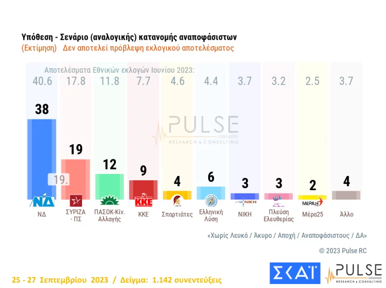 Στην εκτίμηση / σενάριο αναλογικής κατανομής αναποφασίστων, η ΝΔ συγκεντρώνει 38% (χάνοντας μόλις 2,6 μονάδες από τις εθνικές εκλογές) και ο ΣΥΡΙΖΑ κινείται στο 19% (από 17,8% της εθνικής κάλπης). Ακολουθεί το ΠΑΣΟΚ με 12% (από 11,8%) το ΚΚΕ με 9% (από 7,7%), η Ελληνική Λύση με 6%, οι «Σπαρτιάτες» με 4% και εντός Βουλής με 3% η Νίκη και η Πλεύση.