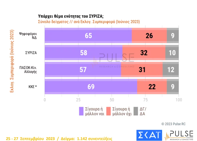 Είναι χαρακτηριστικό ότι ακόμη και ψηφοφόροι του ΣΥΡΙΖΑ σε ποσοστό 58% πιστεύει ότι υπάρχει θέμα ενότητας του κόμματος.