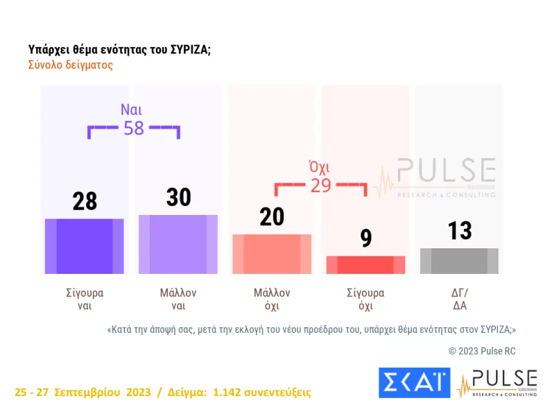 Η πανελλαδική έρευνα που παρουσιάστηκε από τον διευθύνοντα σύμβουλο της Pulse Γιώργο Αράπογλου, στο κεντρικό δελτίο ειδήσεων του ΣΚΑΪ με τη Σία Κοσιώνη διεξήχθη αποκλειστικά μετά την εκλογή του κ. Κασσελάκη ως προέδρου του ΣΥΡΙΖΑ. Η έρευνα της Pulse ξεκίνησε τη Δευτέρα 25-27 Σεπτεμβρίου και έγινε σε δείγμα 1.009 ψηφοφόρων.