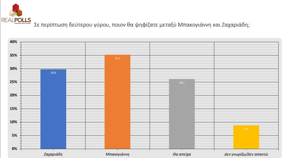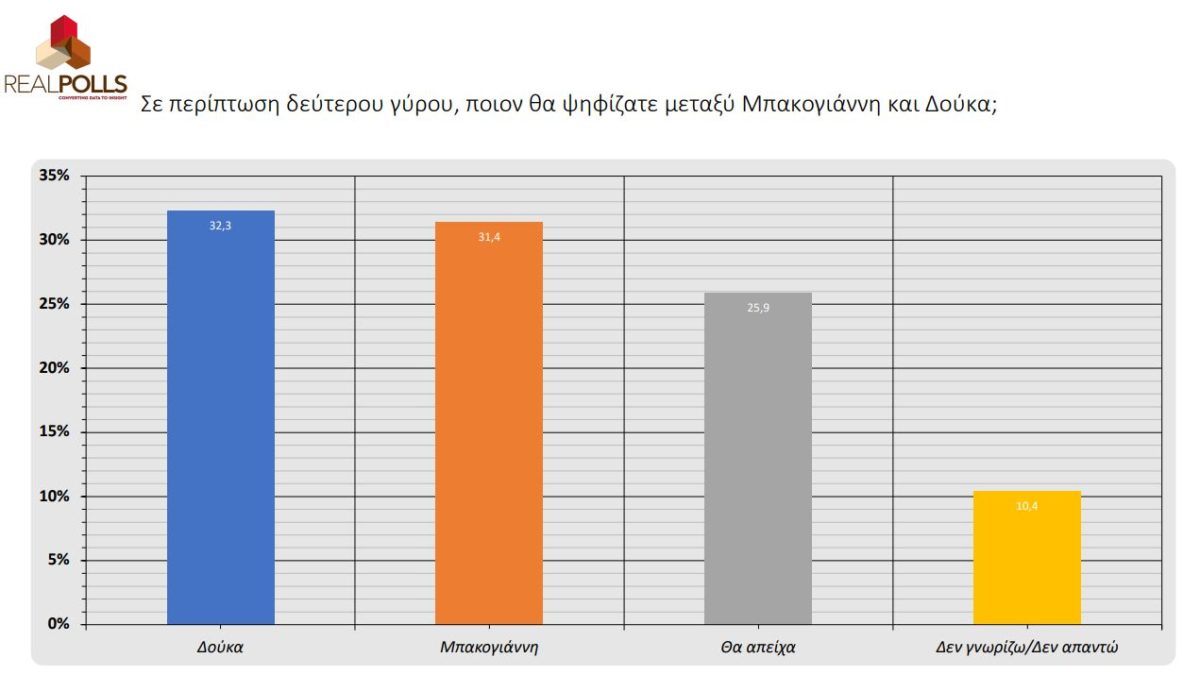 Σε περίπτωση δεύτερου γύρου, σύμφωνα πάντα με τη μέτρηση της Real Polls, ο Κώστας Μπακογιάννης δείχνει να προηγείται έναντι του Κώστα Ζαχαριάδη ενώ σε περίπτωση που βρεθούν αντιμέτωποι Δούκας και Μπακογιάννης τότε ο πρώτος δείχνει να έχει το προβάδισμα με 32,3% έναντι 31,4%.