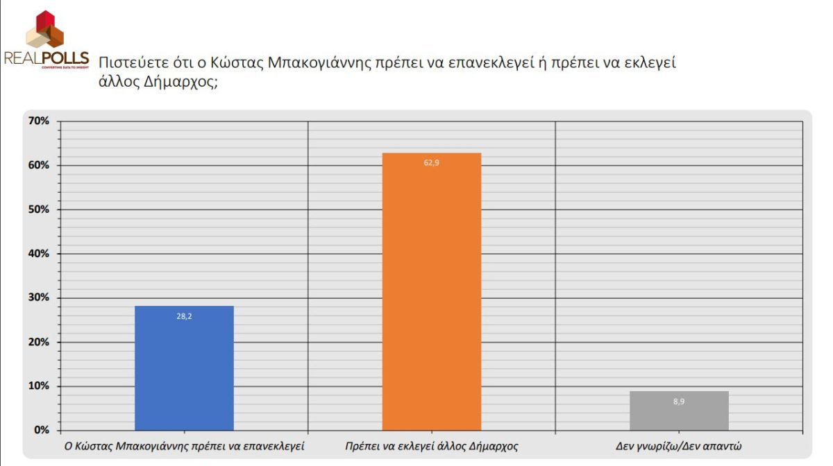 Ιδιαίτερο ενδιαφέρον έχει και η επόμενη κάρτα της δημοσκόπησης καθώς το 62,9% θεωρεί πως πρέπει να εκλεγεί άλλος δήμαρχος, ενώ το 28,2% θέλει ξανά τον Κώστα Μπακογιάννη.