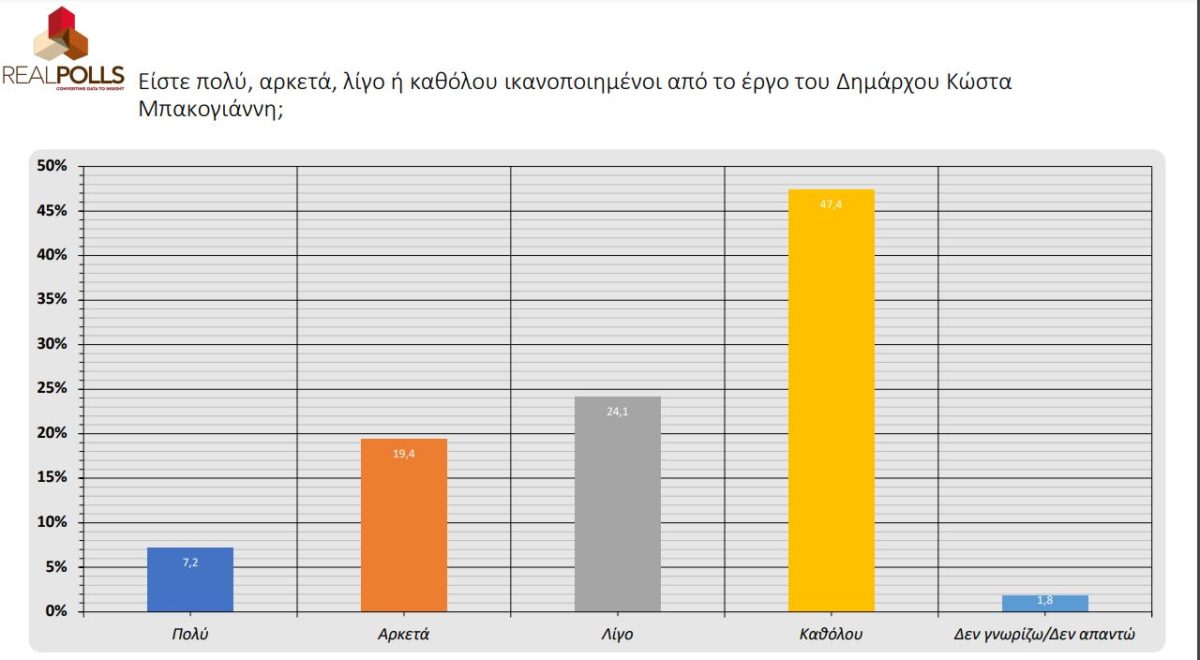 Συγκεκριμένα στη μέτρηση της Real Polls στην ερώτηση: «Είστε πολύ, αρκετά, λίγο ή καθόλου ικανοποιημένοι από το έργο του Δημάρχου Κώστα Μπακογιάννη», το 47,4% δήλωσε «καθόλου», το 24,1% είπε «λίγο», το 19,4% απάντησε «αρκετά» και μόλις 7,2% «πολύ».