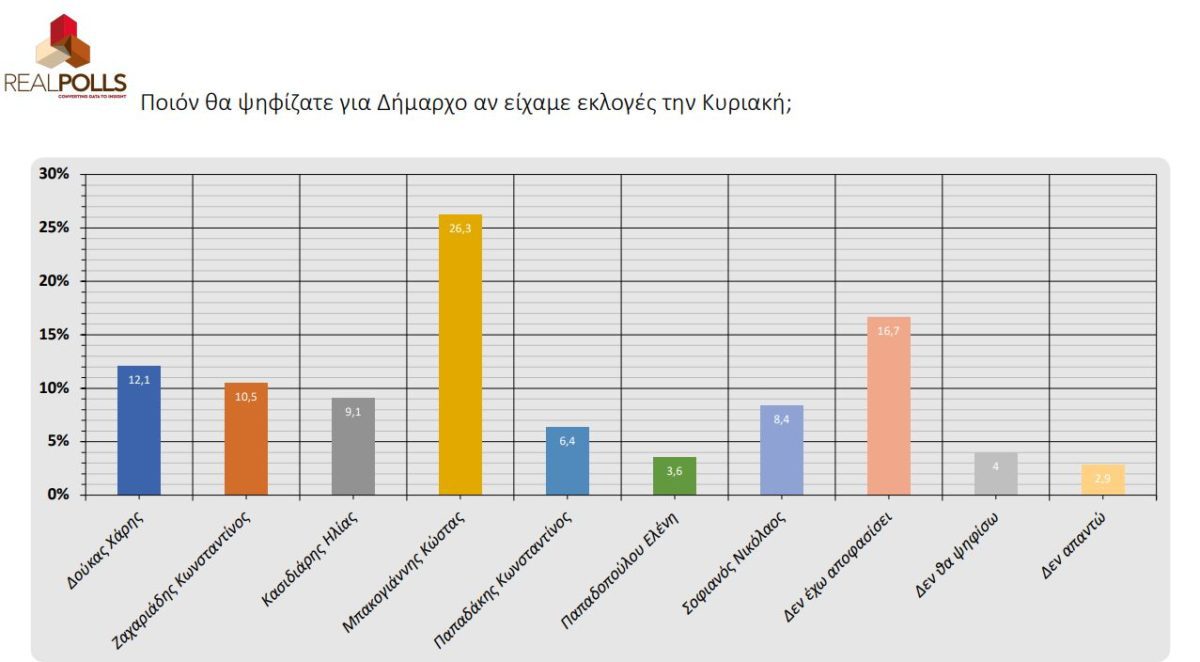 Συνεπώς, στην ερώτηση «ποιον θα ψηφίζατε για Δήμαρχο εάν είχαμε εκλογές την Κυριακή», ο Κώστας Μπακογιάννης είναι πρώτος με 26,3% και ακολουθούν: ο Χάρης Δούκας 12,1% και ο Κώστας Ζαχαριάδης με 10,5%. Εν συνεχεία: Ηλίας Κασιδιάρης με 9,1%, ο Νίκος Σοφιανός με 8,4%, ο Κωνσταντίνος Παπαδάκης με 6,4% και η Ελένη Παπαδοπούλου με 3,6%.