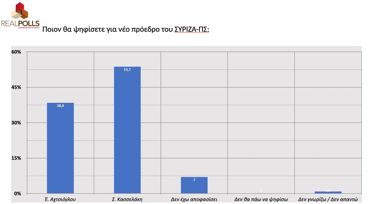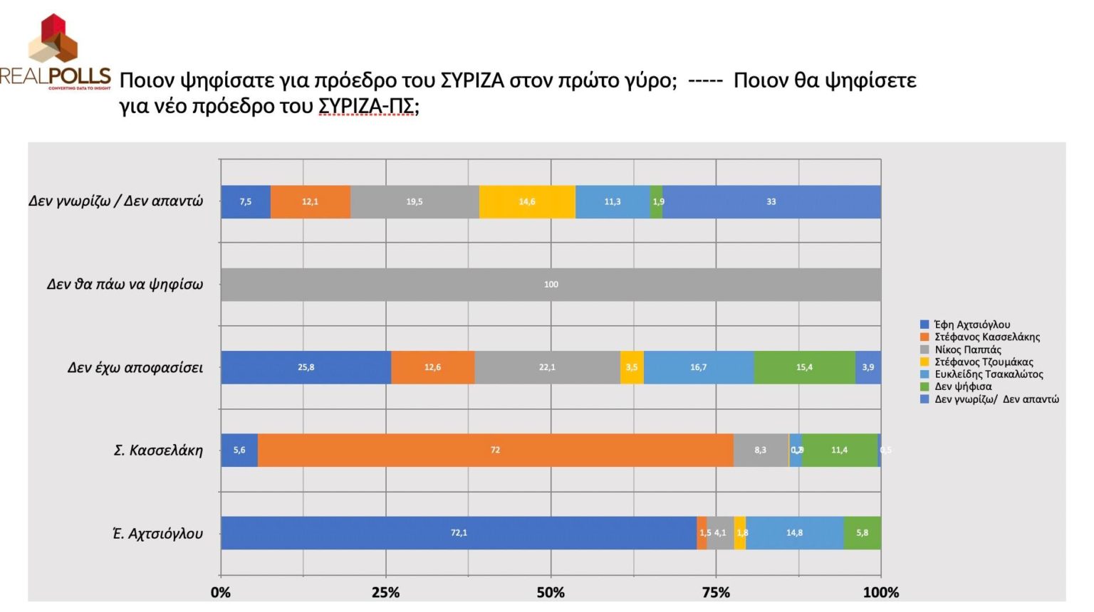 Στην ερώτηση «ποιον θα ψηφίσετε» το 53,7% απαντάει Στέφανο Κασσελάκη και το 38,4% Εφη Αχτσιόγλου, ενώ 7% δεν έχει αποφασίσει.