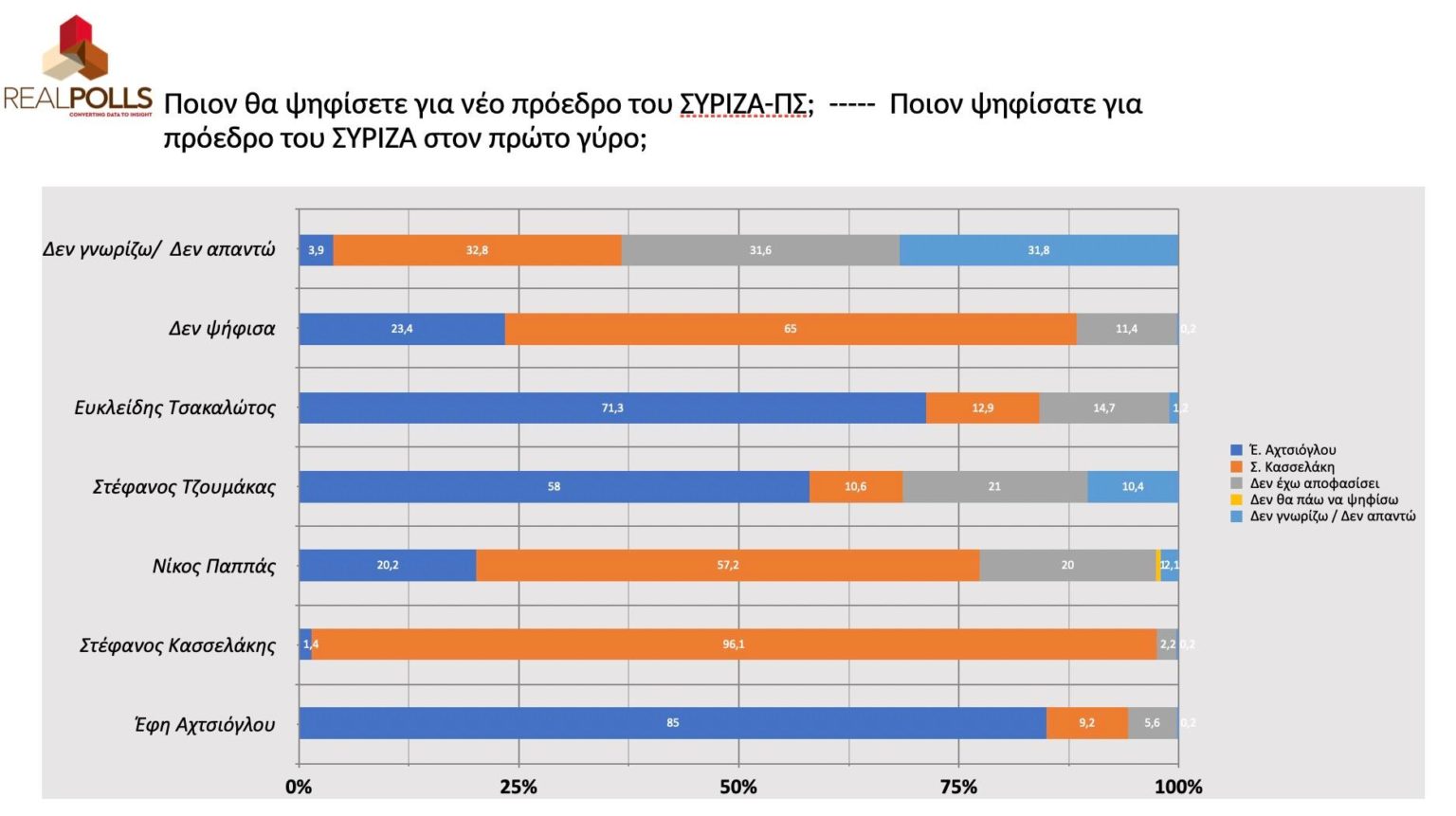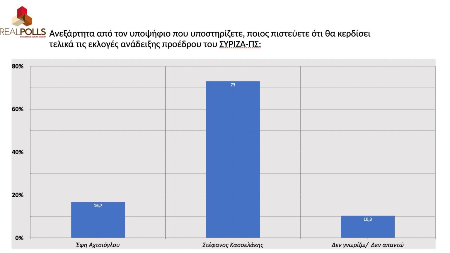 Εντυπωσιακή είναι η διαφορά στην ερώτηση «ποιος πιστεύετε ότι θα κερδίσει». Εκεί το 73% απαντάει Στέφανος Κασσελάκης και μόνο 16,7% Εφη Αχτσιόγλου.