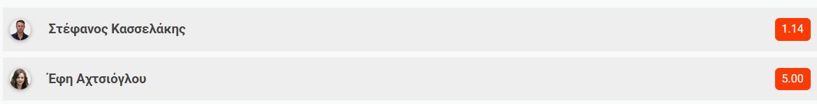 Να θυμίσουμε ότι μετά το τέλος του α’ γύρου οι στοιχηματικές εταιρείες έδιναν 1.65 στον Σ.Κασσελάκη και περίπου 2.15 στην Ε.Αχτσιόγλου.