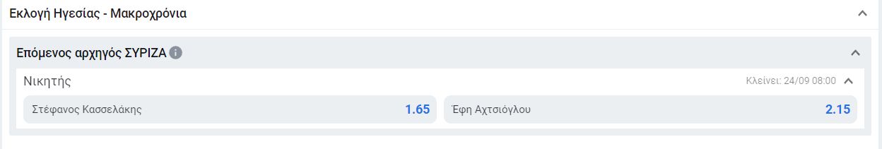 Πρόκειται για όντως εντυπωσιακές αποδόσεις, καθώς δείχνουν ότι ο Κασσελάκης είναι το τεράστιο φαβορί για τη νίκη και είναι σχεδόν απίθανο να ανατρέψει την κατάσταση η Έφη Αχτσιόγλου, η οποία δίνεται σε απόδοση περίπου 5.