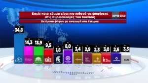 Η Νέα Δημοκρατία στην εκτίμηση ψήφου με αναγωγή στα έγκυρα συγκεντρώνει ποσοστό 34,8% και εξασφαλίζει προβάδισμα 19,5 μονάδων. Ο ΣΥΡΙΖΑ επανέρχεται στην δεύτερη θέση με 14,3% έναντι 13,9% του ΠΑΣΟΚ. ΚΚΕ 9,5% , Ελληνική Λύση 8% και ακολουθούν Νίκη 3,4%, Νέα Αριστερά 3%, Πλεύση Ελευθερίας 2,9%, Δημοκράτες – Α.Λοβέρδος 2,6%, Μέρα 25 2,3% και Σπαρτιάτες 1,8%.