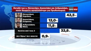 Ως καταλληλότερο πρωθυπουργό κρίνουν οι πολίτες στην δημοσκόπηση της GPO τον Κυριάκο Μητσοτάκη με ποσοστό 42,5%, ακολουθεί ο «Κανένας» στη δεύτερη θέση με 32,8% και έπονται ο Στέφανος Κασσελάκης με 12% και ο Ν. Ανδρουλάκης με 11,8%.
